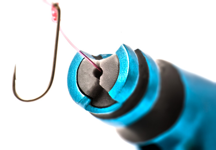 Now, you’re probably thinking how can it help tie a clinch knot? Well…it’s simple really. You slot the hook into the rubber section on the front of the tool, which holds the hook eye in place. A funnel on the top of the tool allows the line to be past straight through the hook eye. The clinch knot is formed by wrapping the line around two rings on the body of the product, and feeding the line back down a second funnel. Then by simply pulling the hook out of the device, the knot can be tightened and the hook secured.